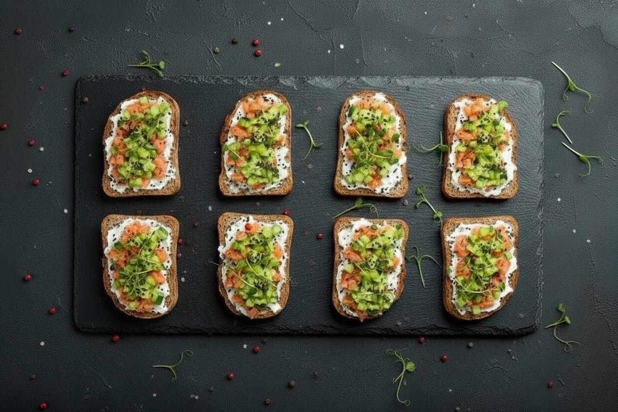 Брускетта с лососем и огурцом. Подается с творожным сыром.