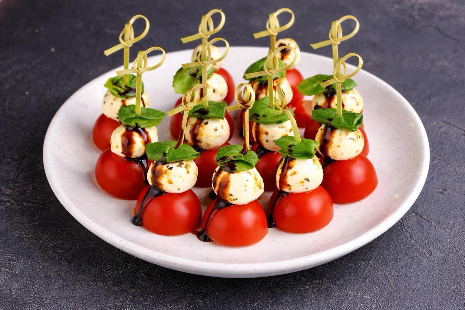 Канапе с сыром моцарелла и томатами чери. Подается с бальзамическим трюфельным соусом.