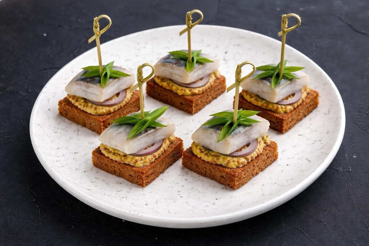 Канапе с сельдью. Подается на бородинском хлебе с зернистой горчицей и зеленым луком.