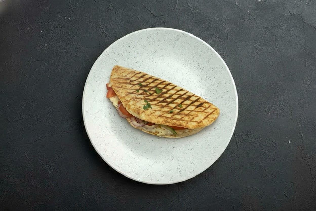 Кесадилья овощная на гриле. Моцарелла, помидоры, перец болгарский, красный лук.